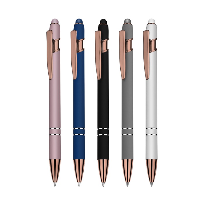 Descrição: Caneta esferográfica em metal escrita em azul com cor fosca. Refil tipo parker com ponta touch emborrachada e detalhe dourado.