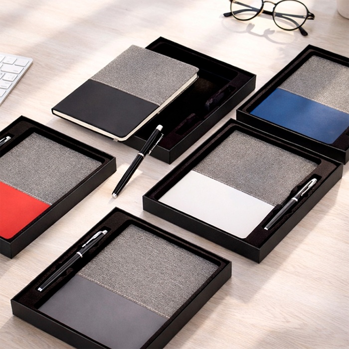 Descrição: Kit executivo composto por dois itens: uma caderneta e uma caneta. A caderneta possui capa em PU, fecho em elástico, marca-páginas em fita de cetim e cerca de 80 folhas marfim pautadas. A caneta metálica possui ponta em plástico ABS e carga esferográfica preta de 0,8 mm. Acompanha caixa em papelão com berço em PET com revestimento aveludado para acomodação dos itens.
