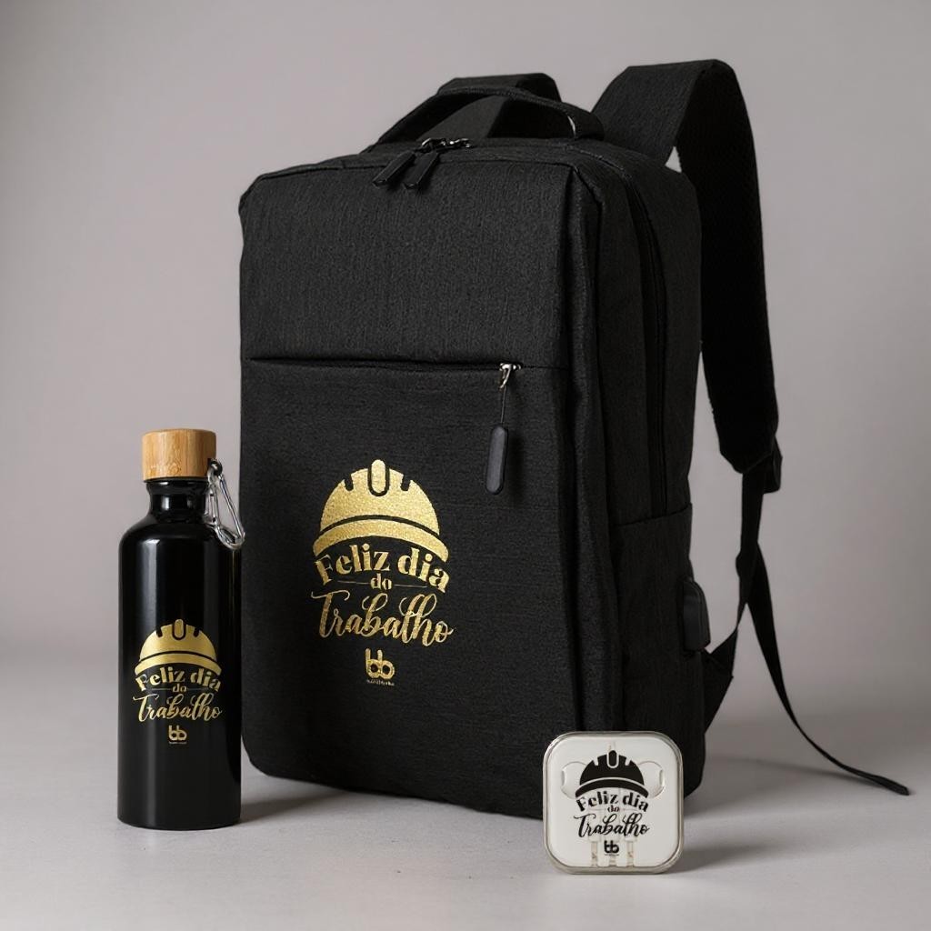 DESCRIÇÃO: 01 – FONE DE OUVIDO C/ MICROFONE 01 – GARRAFA ALUMÍNIO 500ML TAMPA BAMBU 01 – MOCHILA