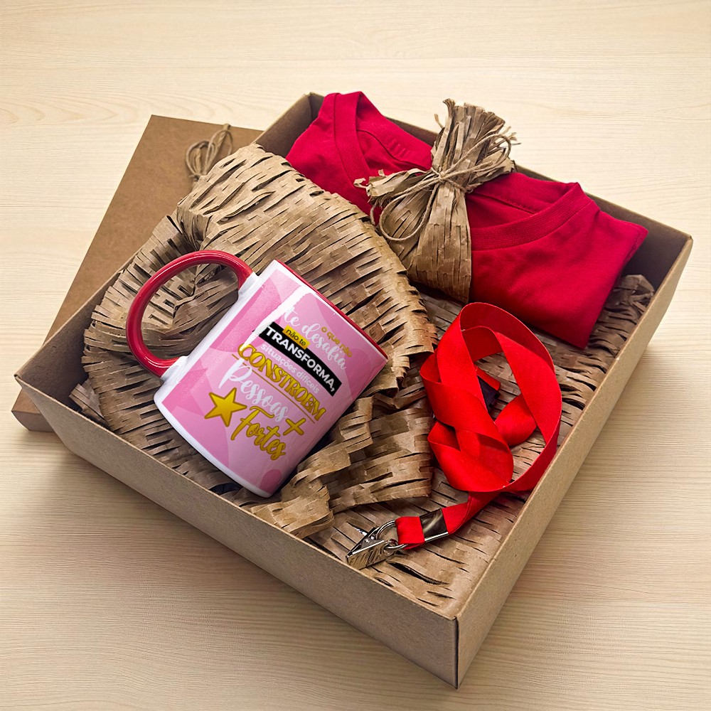 Kit Escritório com caneca alça colorida, cordão para crachá e camiseta