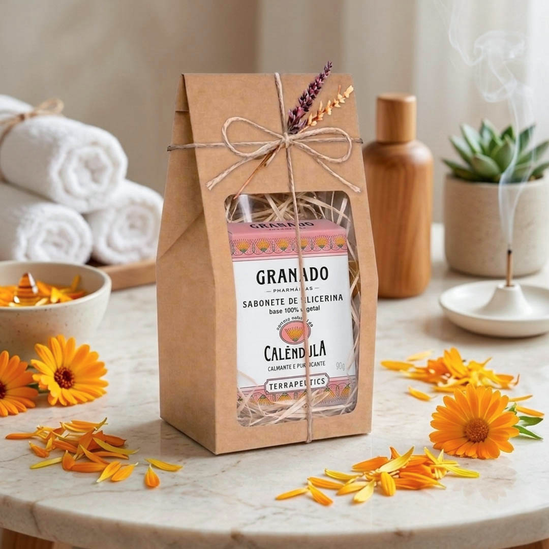 O kit contém: 1 sabonete barra de glicerina granado calêndula 90g 1 caixa 20x15x7cm 1 ramo de flores + sisal