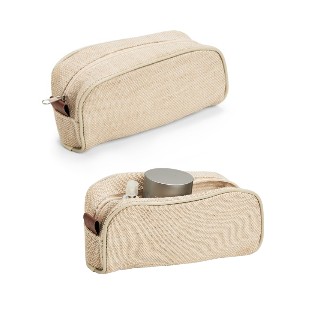 Descrição: Nécessaire confeccionada em juta resistente à água, detalhes em bidim, acabamento em plástico e fechamento em zíper.