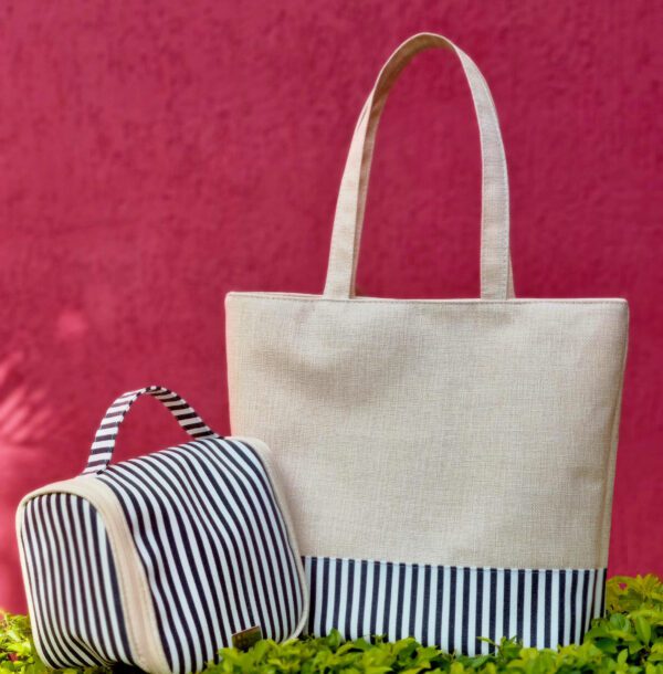 1 BOLSA EM JUTA 34X40X12, FUNDO COM SINTETICO LISTRADO E FECHAMENTO BOTÃO IMÃ