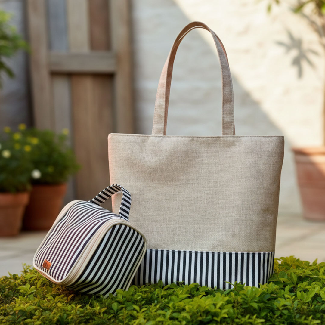 1 Bolsa em juta, fundo com sintético e fechamento em botão imã