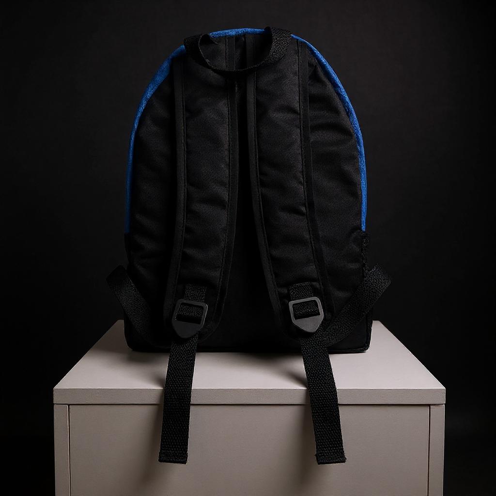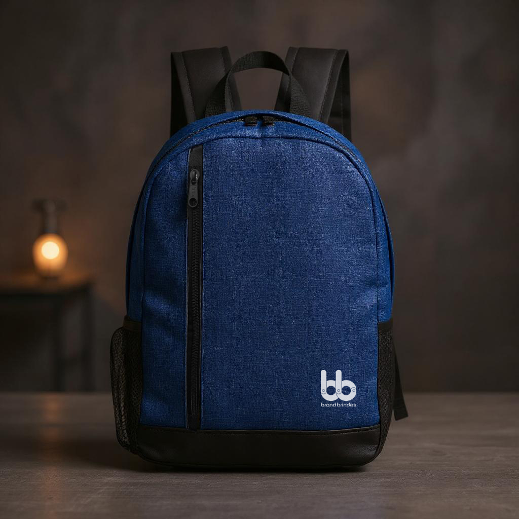 Mochila de nylon sem porta notebook, um bolso lateral, compartimento frontal com zíper e alça de mão.