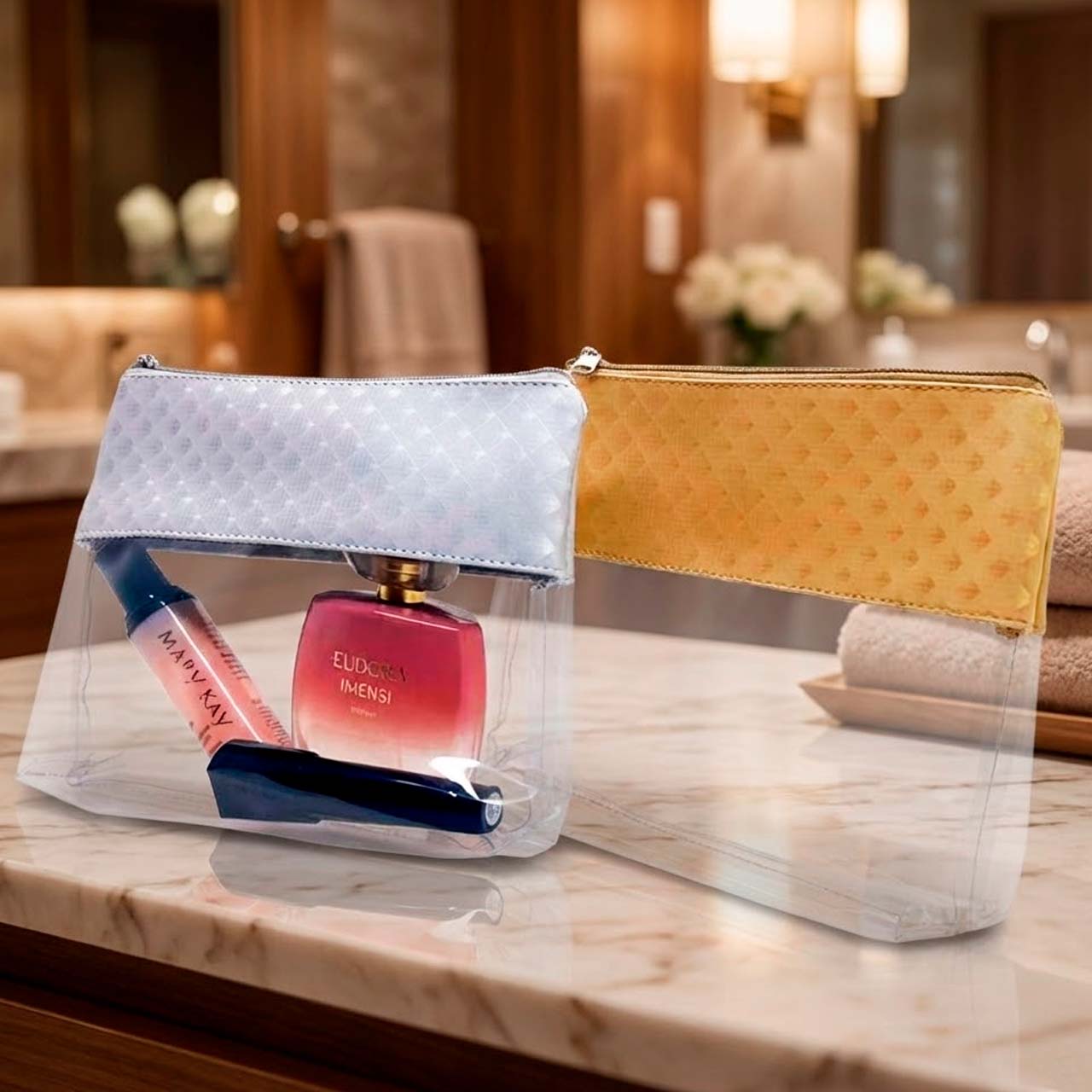 Nécessaire em sintético e cristal PVC com fechmaneto zíper