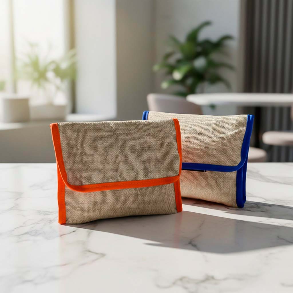 Nécessaire em juta 22,5x21cm, com fechamento em velcro.