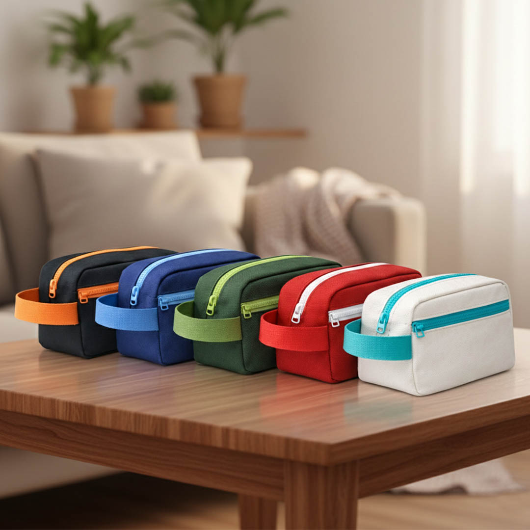 Nécessaire em poliéster com alça e zíper.