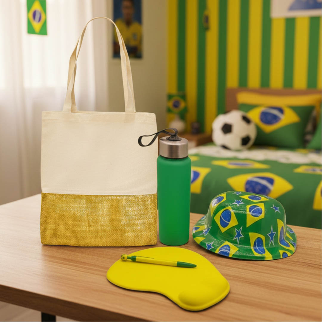 DESCRIÇÃO: 1 SQUEEZE PLÁSTICO 680ML 1 CHAPEU 1 MOUSE PAD 1 SACOLA 40X35 1 CANETA