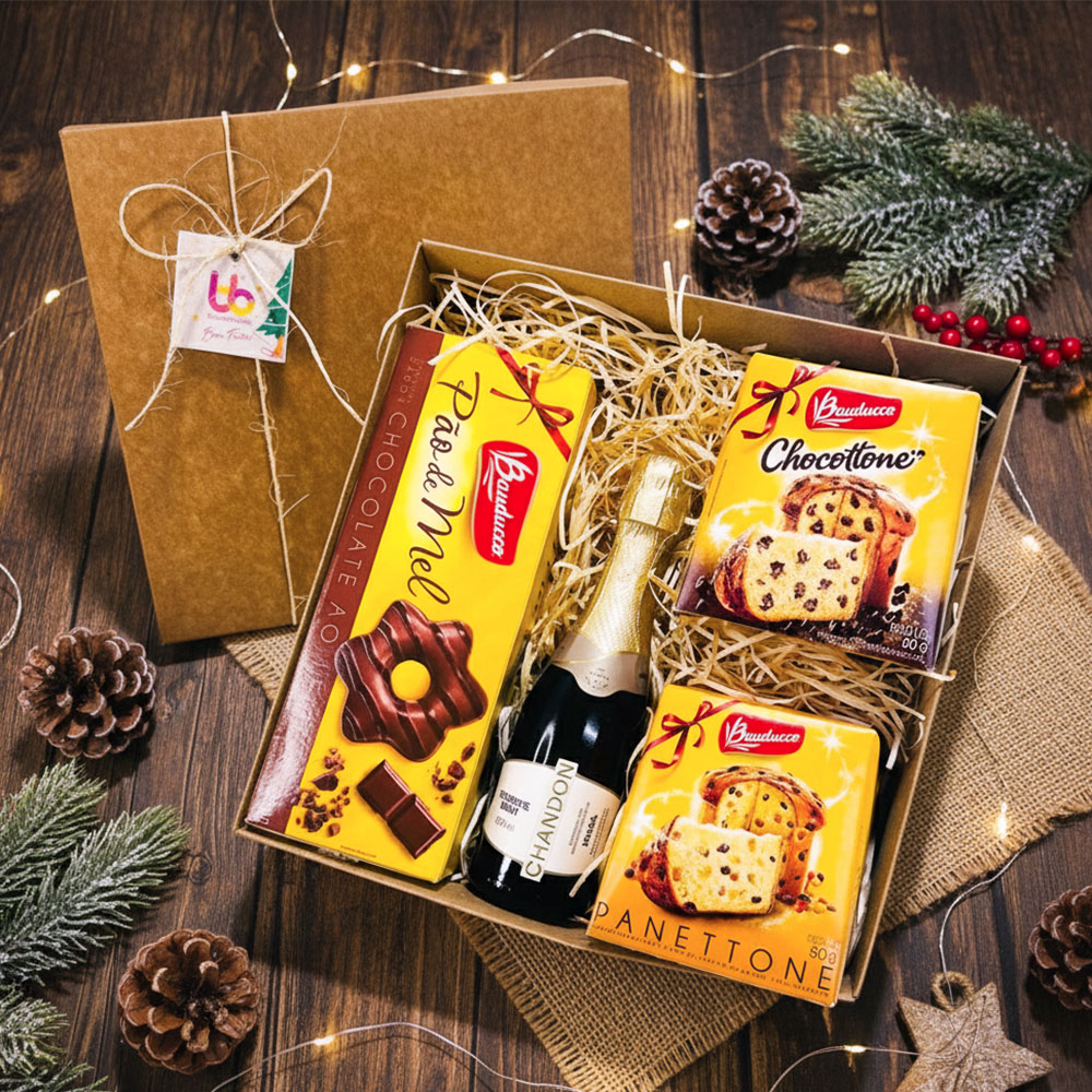 Kit Natal com 4 peças: Mini Panettone e Chocottone, Pão de Mel e Mini Chandon Baby 187ml Brut