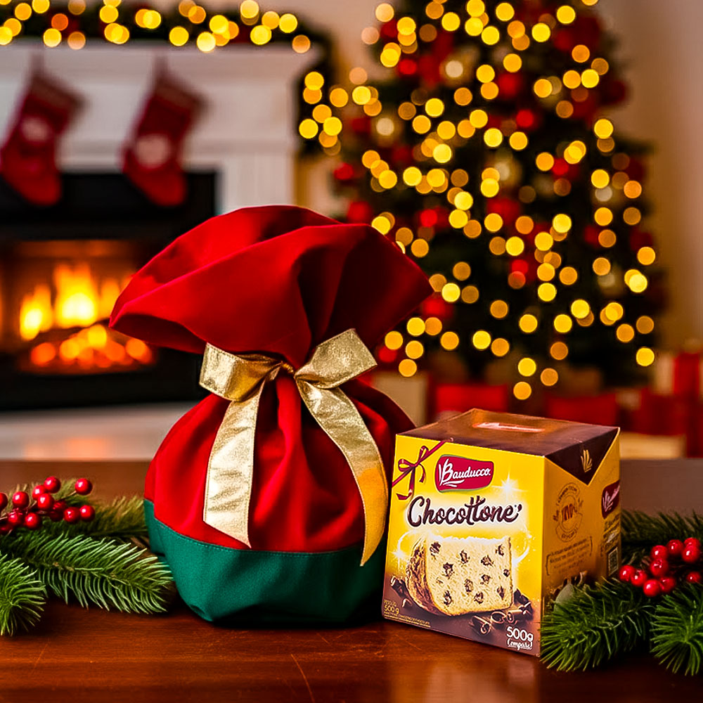 Kit de Natal com Panettone 500 gramas em Embalagem duas cores Natalinas de Veludo com Nylon e fita especial dourada