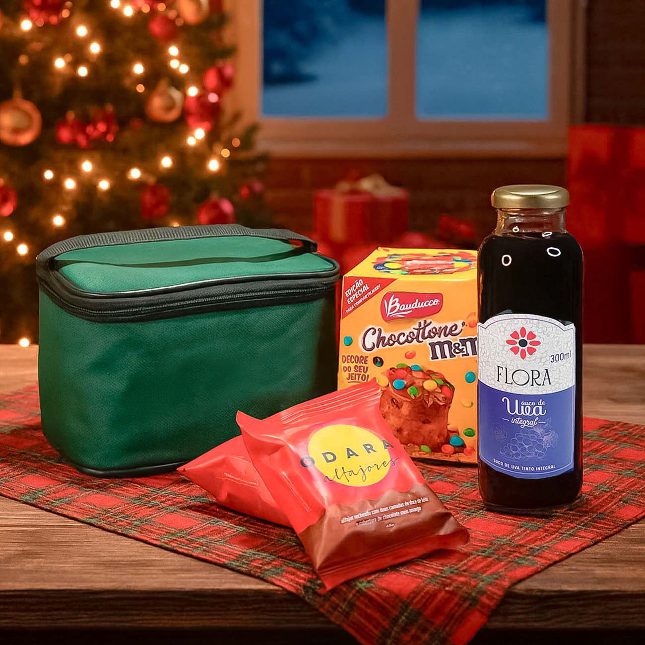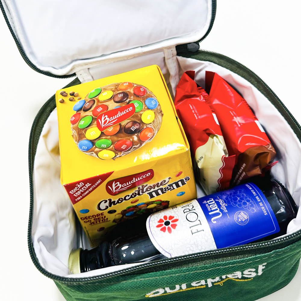 Kit natal com bolsa térmica, mini Chocottone, Suco Flora Uva e Alfajor Odara