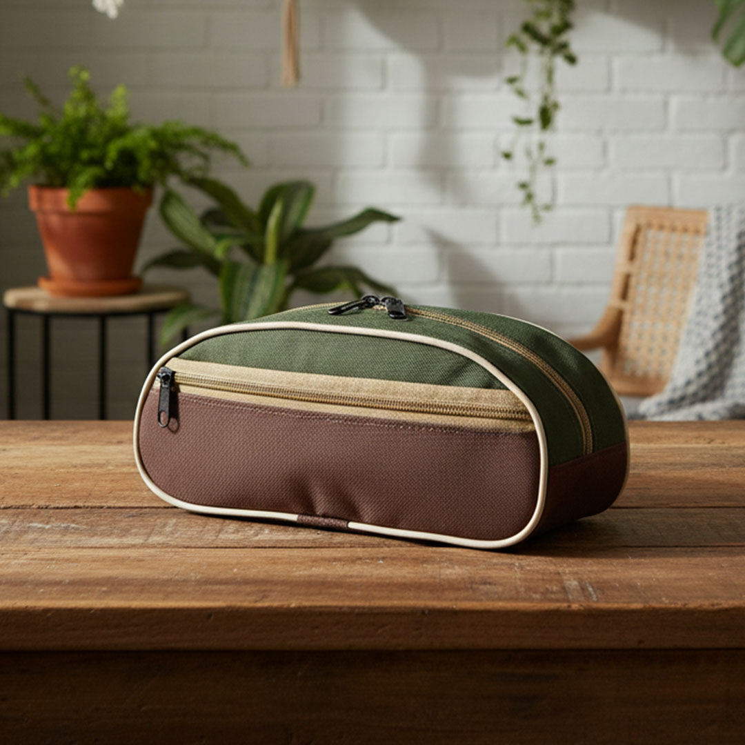 Nécessaire oval em poliéster 600 com vivo na estrutura,