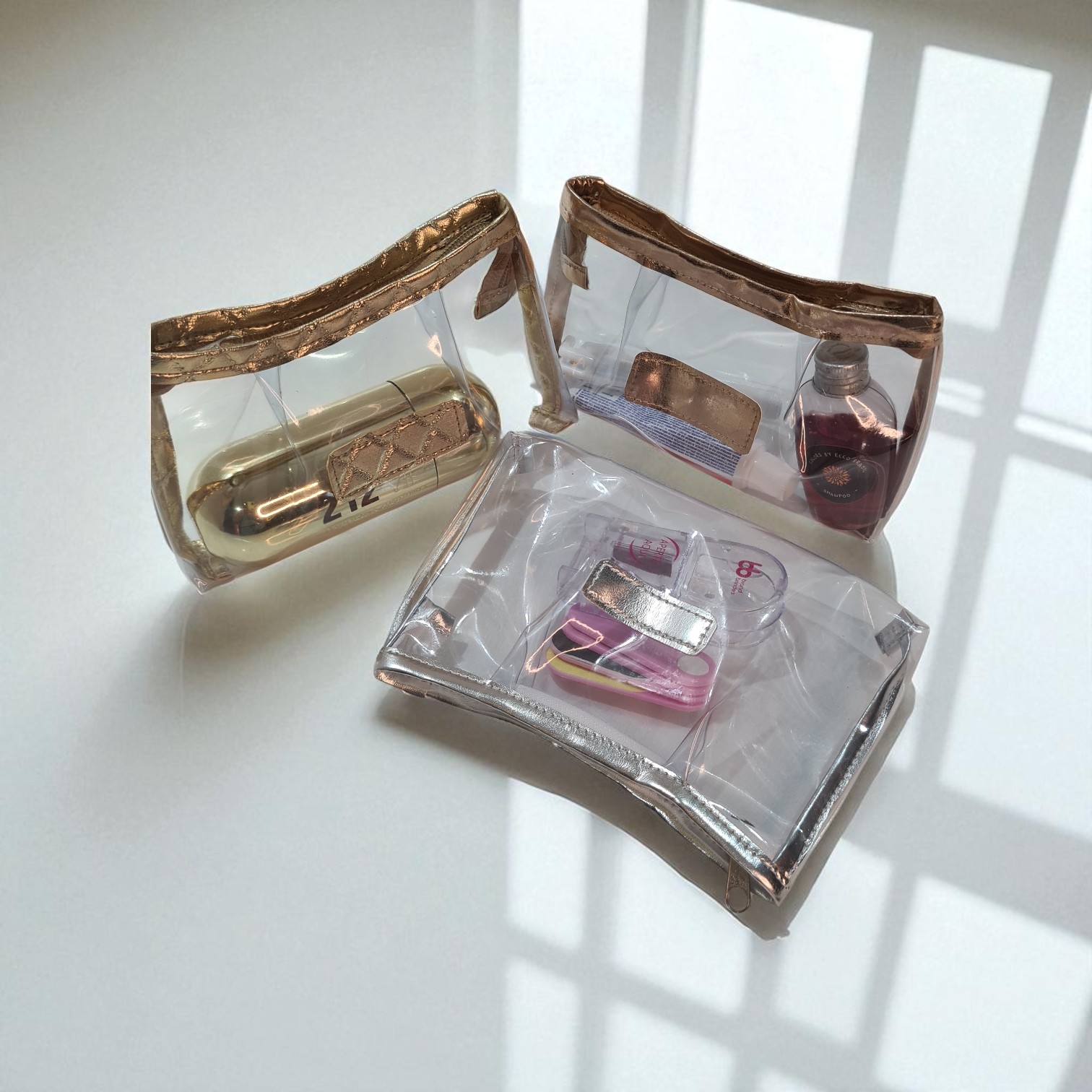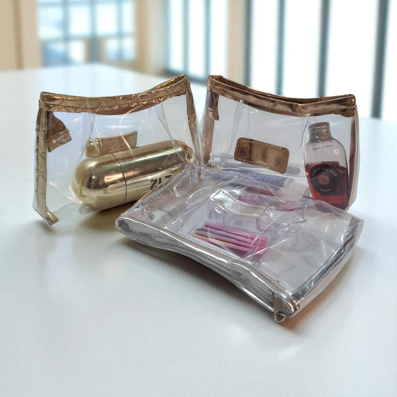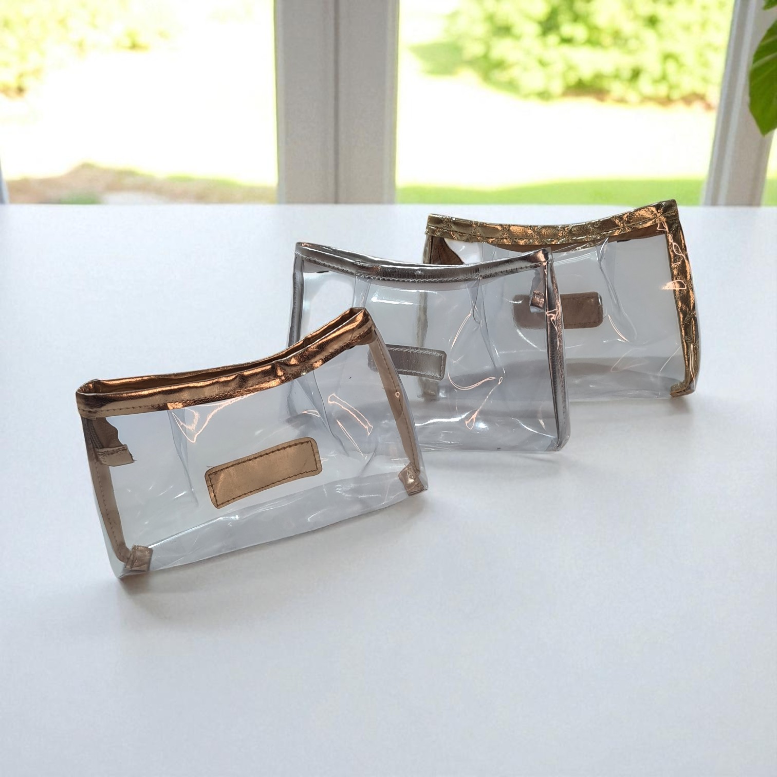Mini nécessaire Multiuso em PVC cristal com viés e detalhe frontal em tecido metalizado.