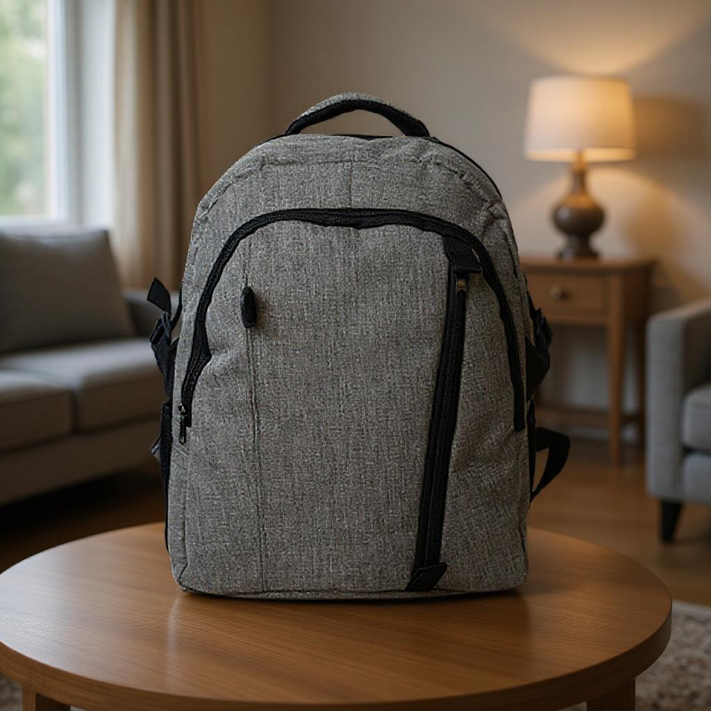 Mochila porta notebook cinza confeccionada em nylon mescla com bolso frontal. bolso no meio, porta caneta e porta treco.