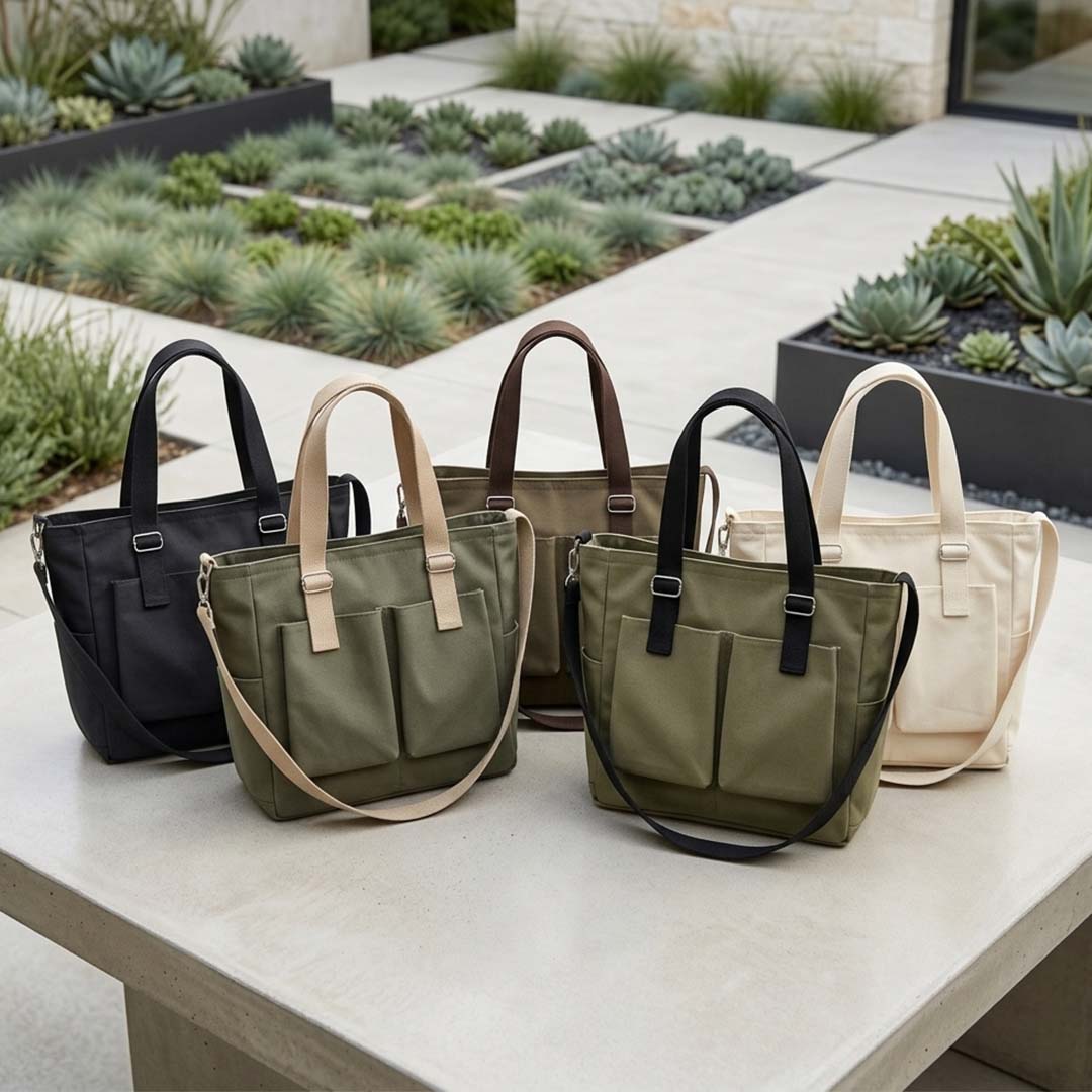 Sacola em nylon, forrada com 1 bolso interno, bolsos na laterais e frontais, fechamento zíper com alça de mão e ombro em fita CA 30mm.