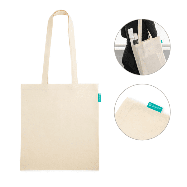 SACOLA 100% ALGODÃO ORGÂNICO (120 G/M²) PROVENIENTE DE UM CULTIVO SUSTENTÁVEL, SEM QUÍMICOS OU PESTICIDAS. ALÇAS DE 60 CM E ETIQUETA LABEL ORGANIC.